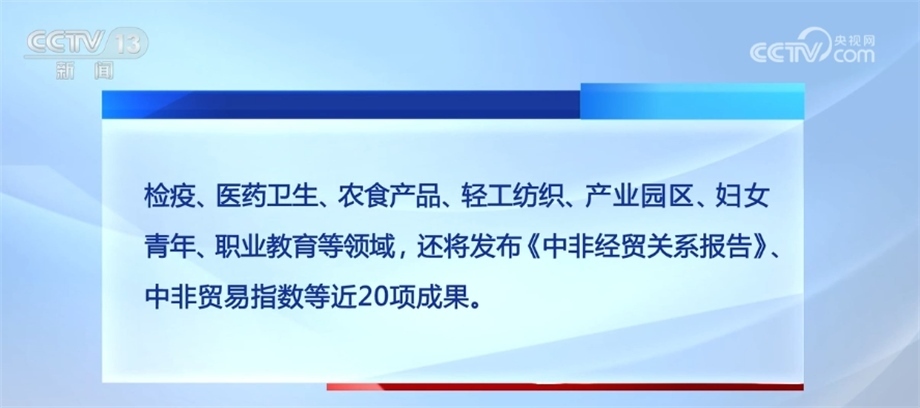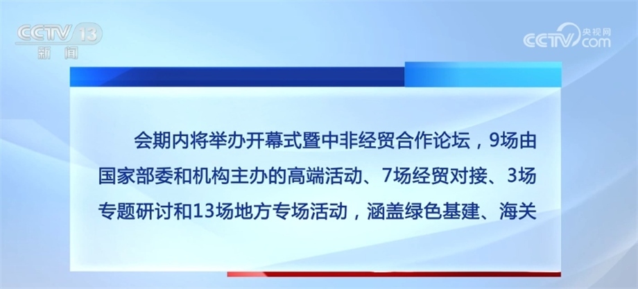 會(huì)期內(nèi)將舉辦開(kāi)幕式暨中非經(jīng)貿(mào)合作論壇,9場(chǎng)由國(guó)家部委和機(jī)構(gòu)主辦的高端活動(dòng)、7場(chǎng)經(jīng)貿(mào)對(duì)接、3場(chǎng)專(zhuān)題研討和13場(chǎng)地方專(zhuān)場(chǎng)活動(dòng),涵蓋綠色基建、海關(guān)檢疫、醫(yī)藥衛(wèi)生、農(nóng)食產(chǎn)品、輕工紡織、產(chǎn)業(yè)園區(qū)、婦女青年、職業(yè)教育等領(lǐng)域,還將發(fā)布《中非經(jīng)貿(mào)關(guān)系報(bào)告》、中非貿(mào)易指數(shù)等近20項(xiàng)成果。