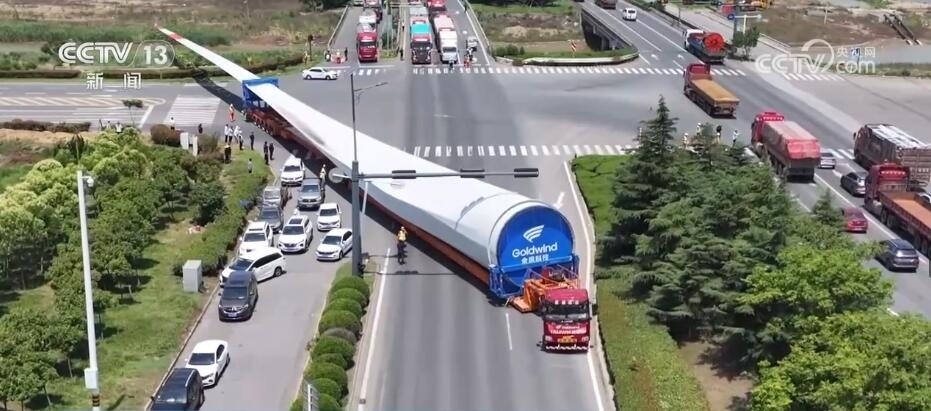 央視網(wǎng)消息:今天(6月14日)上午,100%我國自主知識產(chǎn)權(quán)的123米超長海上風電葉片在江蘇連云港啟動陸地轉(zhuǎn)運工作。上午9時,代表著我國風電裝備最新技術(shù)水準的大葉片,從廠區(qū)到港口碼頭,陸地運輸全程約30公里,耗時約3到4個小時,其中運輸大葉片的車輛還要拐過90度的直角彎。如此大體量的裝備運輸是一個復雜的過程,其中有哪些技術(shù)難點?來看記者今天上午從現(xiàn)場發(fā)回的報道。