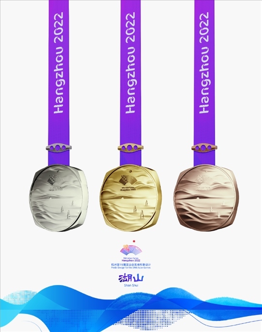 獎(jiǎng)牌取名為“湖山”,它的設(shè)計(jì)靈感源自五千年良渚文明,展示中國(guó)江南文化,呈現(xiàn)杭州山水景觀。在亞運(yùn)會(huì)獎(jiǎng)牌設(shè)計(jì)中首次將方形玉琮和圓形獎(jiǎng)?wù)氯跒橐惑w,其中獎(jiǎng)牌正面用凸出的線(xiàn)條勾勒出“三面云山一面城”的杭城畫(huà)卷,湖水漣漪,山巒起伏;獎(jiǎng)牌背面,形似方形印章,寓意運(yùn)動(dòng)員們?cè)诤贾輥嗊\(yùn)會(huì)上留下美好的印記。