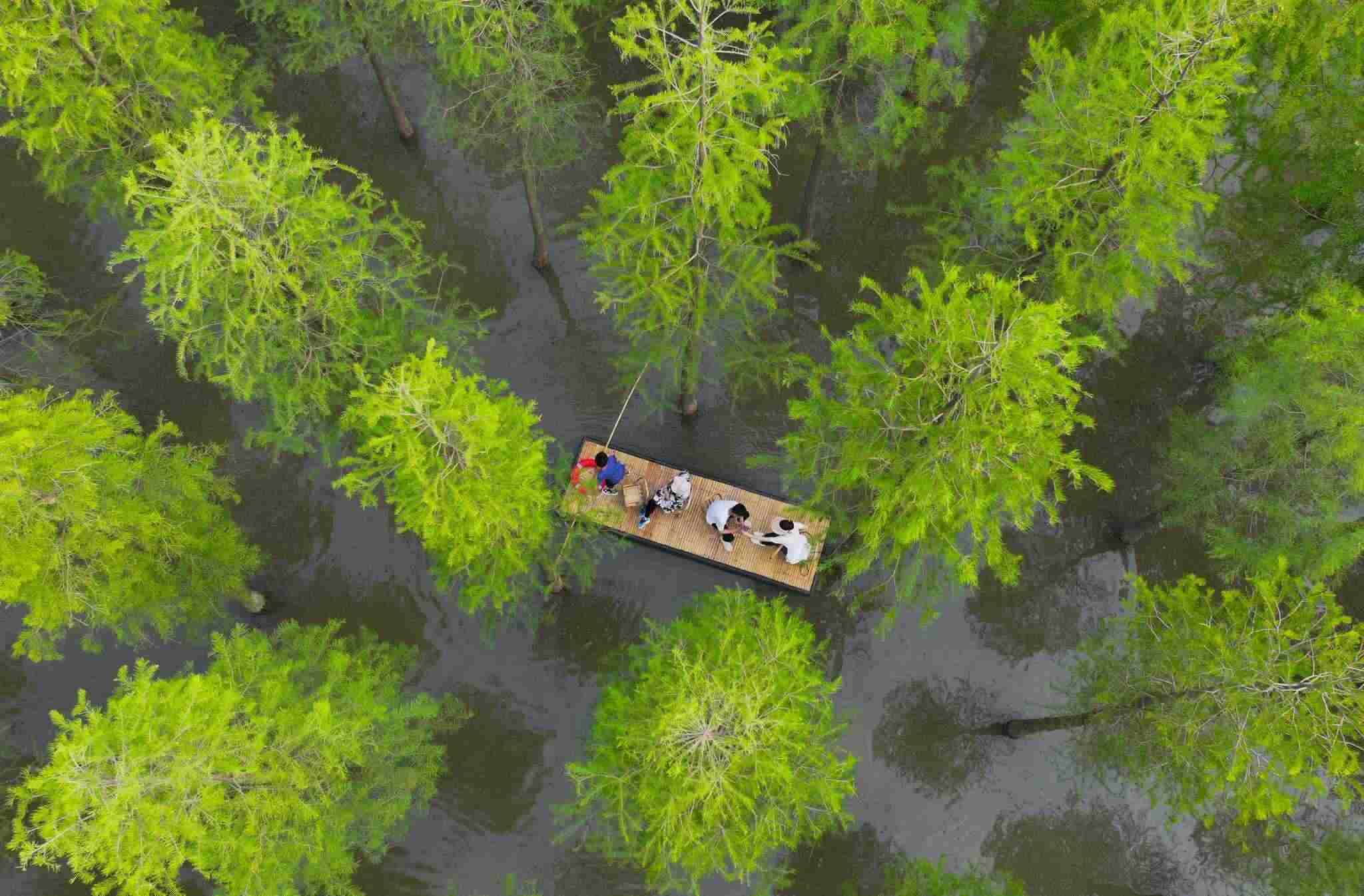 2023年6月16日,江蘇省宿遷市,泗洪縣洪澤湖濕地水杉林滿目蒼翠、郁郁蔥蔥,游客乘坐竹筏,在水杉林間穿梭游玩。視覺中國(guó)