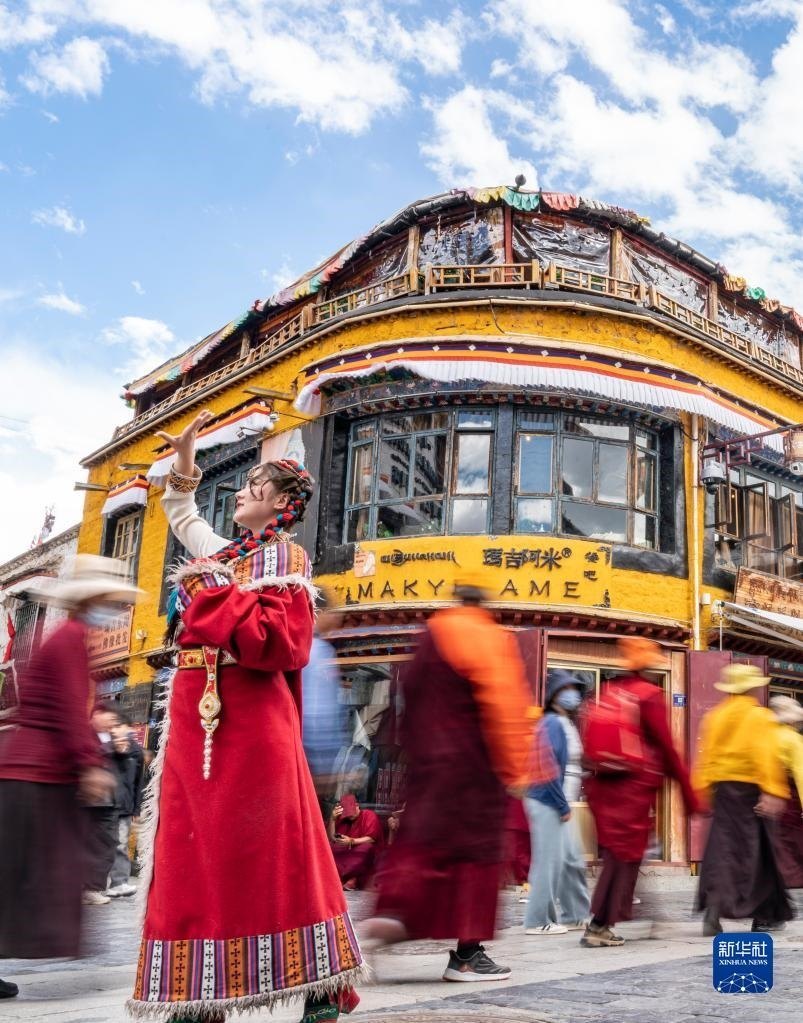 游客身著藏裝在八廓街拍照留念(6月13日攝)。