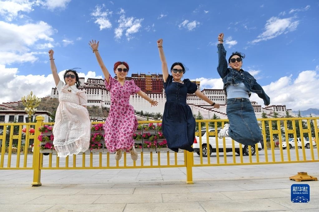 游客在布達(dá)拉宮廣場(chǎng)上合影留念(6月15日攝)。
