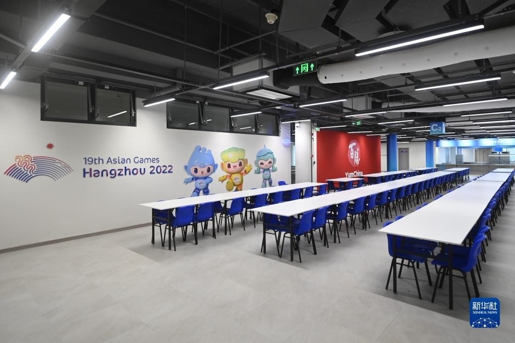 這是6月16日拍攝的杭州亞運村運動員餐廳內(nèi)景。