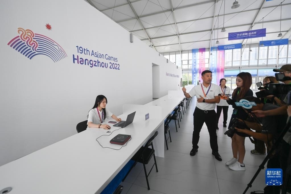 6月16日,工作人員在杭州亞運村歡迎中心介紹服務(wù)流程。歡迎中心包含代表團(tuán)歡迎中心、媒體中心和訪客中心三個部分,其中代表團(tuán)歡迎中心是所有代表團(tuán)抵達(dá)亞運村的第一站,將提供24小時全天候服務(wù)。