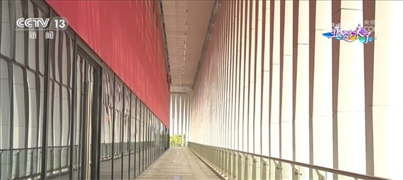 總臺央視記者 任梅梅:現(xiàn)在我們就來到了手球館室外的二層平臺,進(jìn)入了“水?!钡膬?nèi)部,這一條條垂著的“水幔”其實不僅僅是裝飾品,更有著實際的作用,它們就像百葉窗一樣,能夠起到隔熱的效果,另外還可以減少眩光,提高室內(nèi)視覺的舒適度。