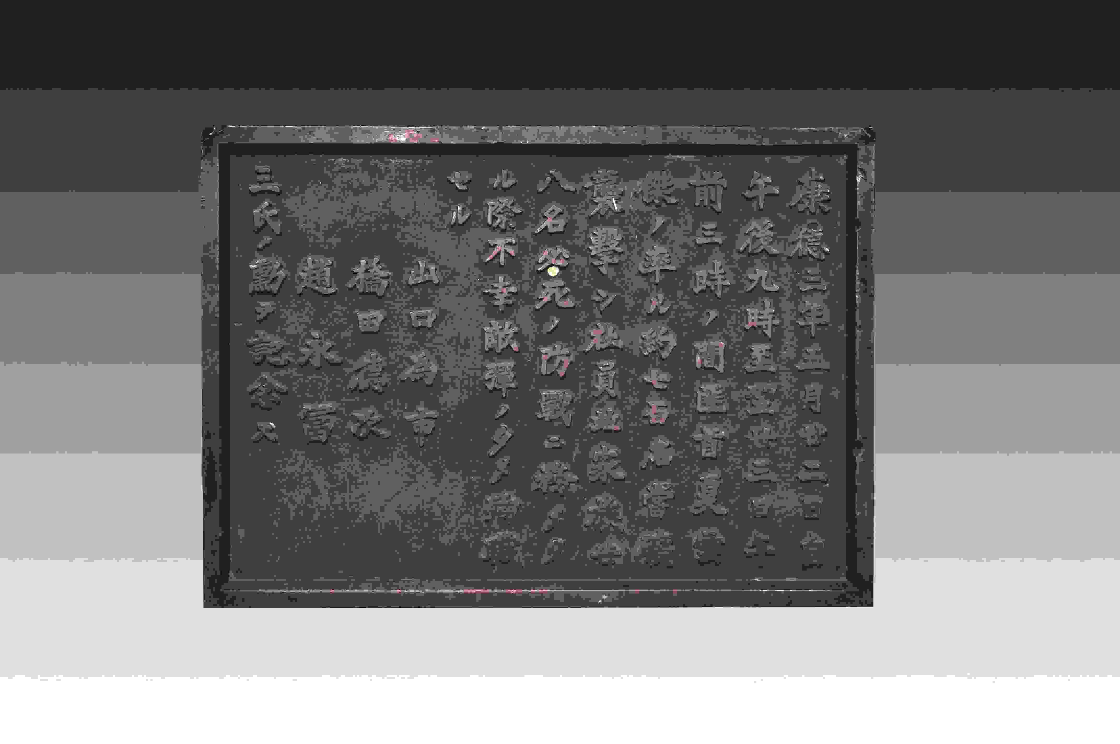 這塊碑文銅牌來自黑龍江鶴崗礦區(qū)的一座“忠靈塔”上,是日本侵略者為侵華戰(zhàn)爭中戰(zhàn)死的日偽軍而建。碑文銅牌,長51厘米、高36.5厘米、寬2厘米、重12千克。上面的文字記載了日偽軍和抗聯(lián)戰(zhàn)士戰(zhàn)斗過程。從表述內(nèi)容來看,這塊碑文具有極大欺騙性。它制造了普通百姓遭土匪襲擊的“無辜”假象,妄圖以此加深東北民眾與革命隊(duì)伍之間的對立情緒。而事實(shí)真相是,1936年5月22日夜,東北人民革命軍第六軍軍長夏云杰指揮六軍第一、二、三團(tuán),分兵兩路襲擊了鶴崗礦山。在我黨地下工作人員的密切配合下,順利解除了礦山警察二隊(duì)的全部武裝,并擊斃日軍指導(dǎo)官山口為市、橋田德次和偽礦山警察大隊(duì)隊(duì)長趙永富。這次戰(zhàn)斗繳獲敵人大批槍支彈藥,我軍無一人傷亡。23日凌晨,夏云杰率領(lǐng)部隊(duì)攜帶戰(zhàn)利品凱旋。