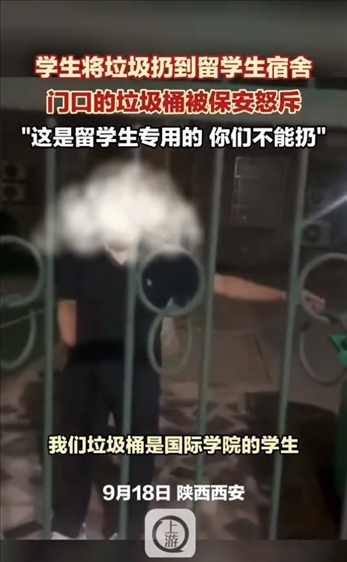 ·西安交大學生用留學生宿舍垃圾桶遭保安怒斥,學?;貞簳ο嚓P人員進行批評教育。