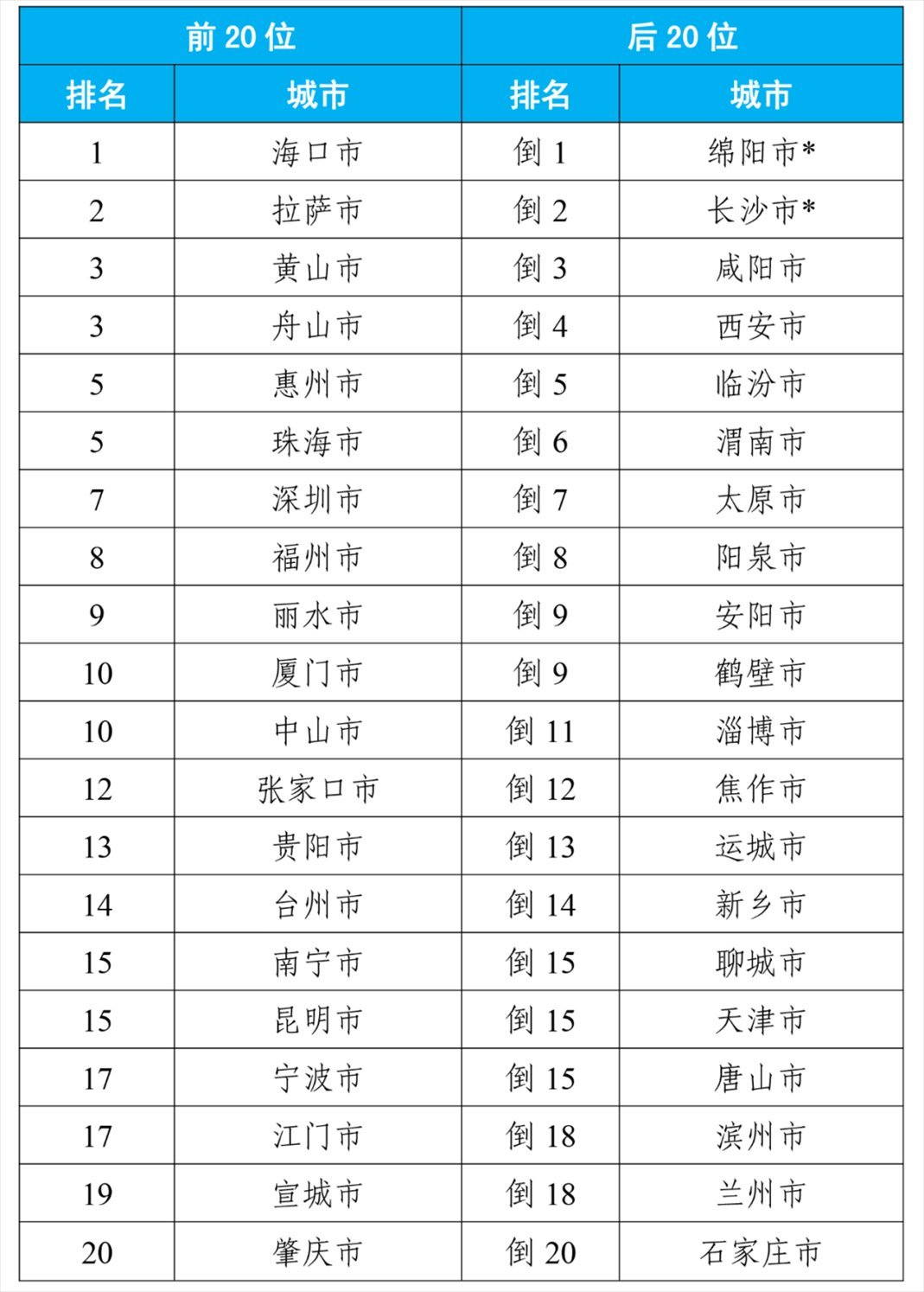 1—8月,168個重點城市中,空氣質(zhì)量排名前20位城市依次是海口、拉薩和黃山等城市(從第1名至第20名);空氣質(zhì)量排名后20位城市依次是綿陽、長沙和咸陽等城市(從倒數(shù)第1名至倒數(shù)第20名)。其中,綿陽市科技城新區(qū)的高新區(qū)自來水公司站點4月和5月、長沙市開福區(qū)的伍家?guī)X站點6月受到嚴重人為干擾,對所在城市當月六項污染物濃度進行了最大值替代處理。見附表2。