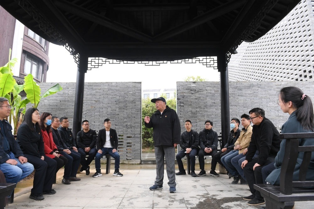 浙江紹興諸暨市楓橋鎮(zhèn)魏廉村老黨員魏杏根(中)在楓橋經(jīng)驗陳列館的亭子內和年輕黨員分享當年運用“楓橋經(jīng)驗”化解基層矛盾的故事(2021年4月11日攝)。