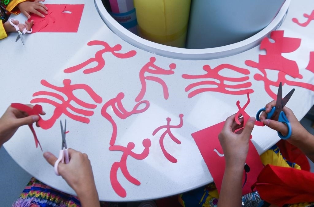 9月13日,孩子們?cè)诶蠋煹膸ьI(lǐng)下創(chuàng)作亞運(yùn)會(huì)運(yùn)動(dòng)項(xiàng)目的主題剪紙作品。新華社記者 徐昱 攝