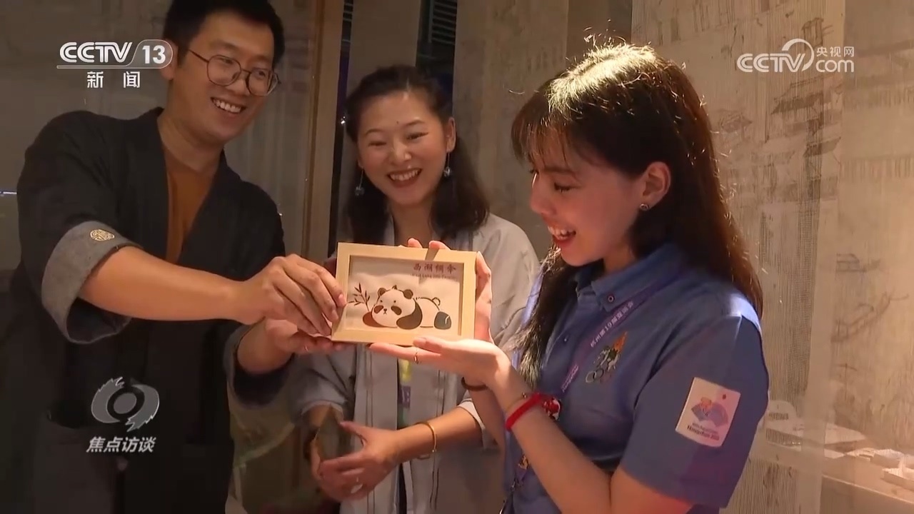 村里的文化市集里同樣熱鬧非凡,竹編、剪紙、皮影戲……每一個展位面前都圍著不少外國運動員。來自泰國的擊劍運動員正在體驗綢傘刷花。在刷子涂上顏料,再和絲網(wǎng)進行充分摩擦,顏料就會透過刻板平鋪在畫布上,精美的熊貓圖案就做出來了。當?shù)弥@是綢傘上的技術(shù)時,運動員班提達十分驚訝。