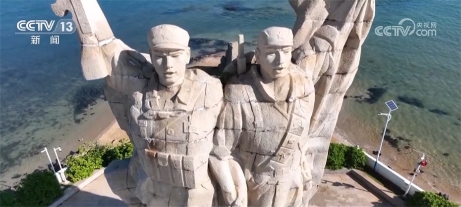 跟隨鏡頭,我們來(lái)到位于海南臨高縣北部海岸的海南解放公園,這里是解放海南渡海登陸戰(zhàn)主要登陸點(diǎn)之一。藍(lán)天碧海間,屹立著熱血豐碑紀(jì)念雕像,兩個(gè)戰(zhàn)士手拉著手,勝利吶喊,象征人民解放軍在瓊崖革命力量的大力配合下,創(chuàng)造戰(zhàn)爭(zhēng)史上“木船打軍艦”渡海作戰(zhàn)的壯舉。軍民共建,英勇無(wú)畏。