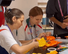 9月25日,一名日本運動員(右)在淳安賽區(qū)傳統(tǒng)工藝體驗坊和志愿者合影。