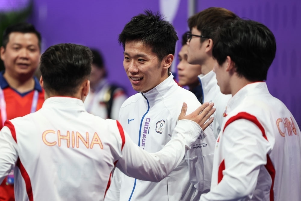 9月28日,中國臺北選手李智凱(中)和中國隊選手在體操鞍馬決賽中互致問候。