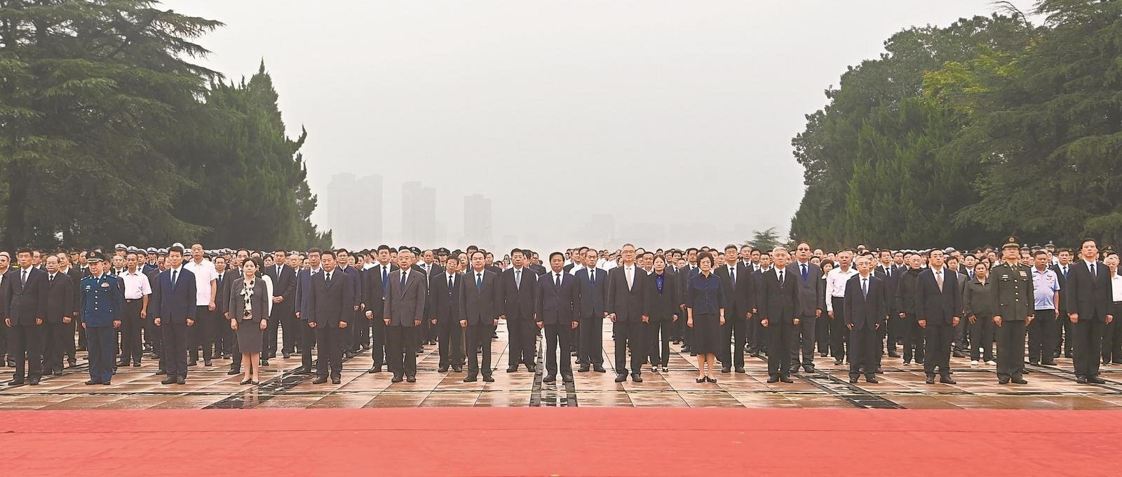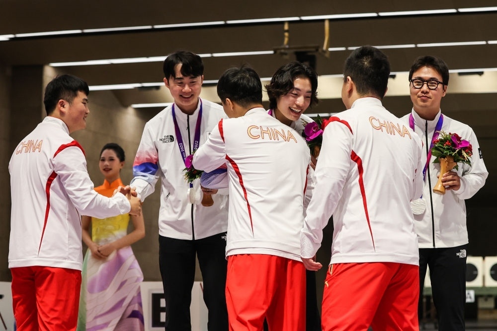9月25日,冠軍中國隊選手李越宏(左三)、劉楊攀(左一)、王鑫杰(右二)在男子25米手槍速射團(tuán)體頒獎儀式上向亞軍韓國隊致意。