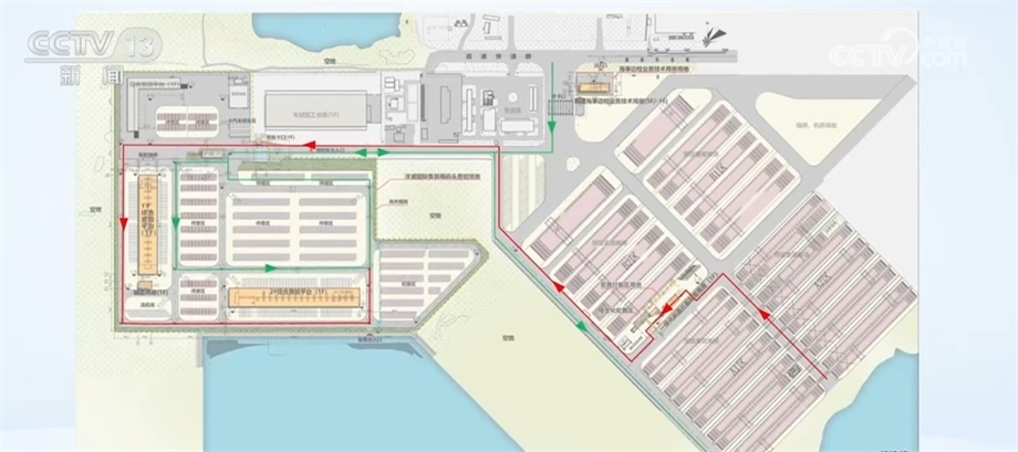 海南洋浦保稅港區(qū)發(fā)展局局長 張洪光:紅色的就是一線的流線,綠色的就是二線的流線,它們是不交叉的,如果需要查驗(yàn)的話,它們是可以共用這個(gè)查驗(yàn)平臺的。我做這樣的最終目的也是確保一線真正能夠放開,二線能夠真正管住。