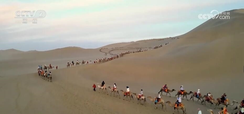 總臺記者 張磊:我現(xiàn)在所在的位置是敦煌的鳴沙山月牙泉景區(qū)。隨著暑期到來,當?shù)氐穆糜稳藬?shù)也在不斷攀升。大家可以在我身后看到,游客現(xiàn)在正在騎著駱駝沿著鳴沙山腳下不斷蜿蜒穿行,場面顯得十分壯觀。以前,只有在小長假期間才會出現(xiàn)的“堵駱駝”的現(xiàn)象,這兩天已經(jīng)成為常態(tài)。