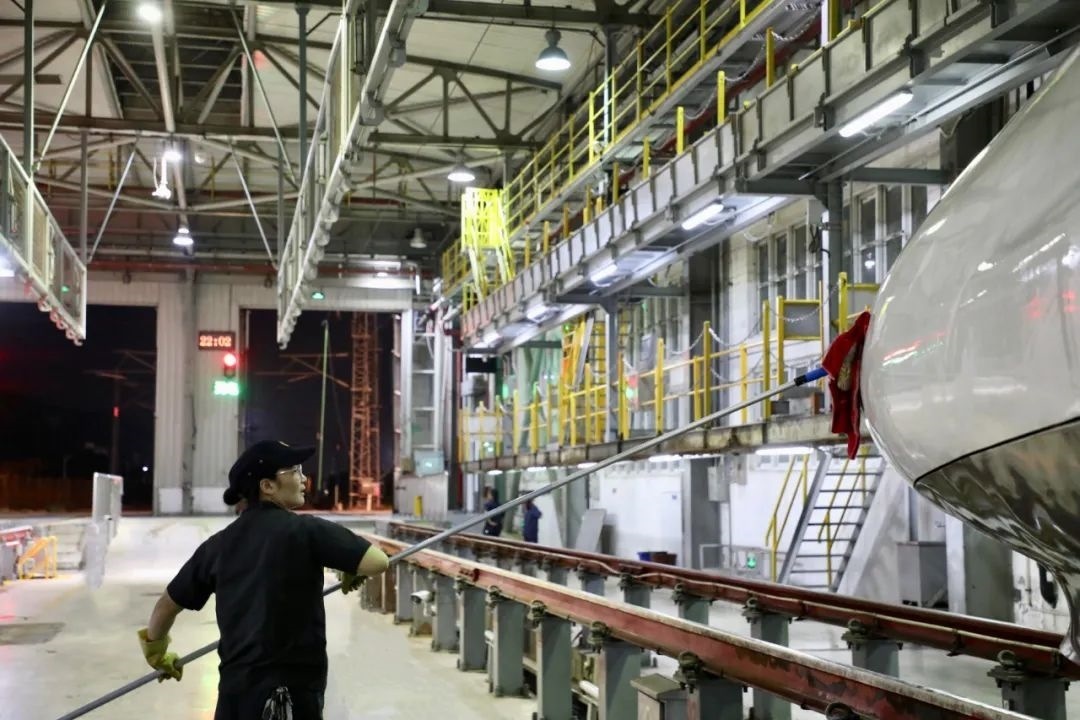 動車組經(jīng)過洗車機(jī)時,調(diào)度室內(nèi)調(diào)度員精準(zhǔn)聯(lián)控司機(jī),機(jī)房有專業(yè)的設(shè)備操作人員負(fù)責(zé)監(jiān)控,確保洗車機(jī)正常運轉(zhuǎn),外皮清洗到位。在動車檢修庫內(nèi),質(zhì)檢員全方位卡控人工清洗環(huán)節(jié),檢查清潔是否到位。