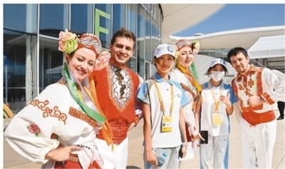 近日,上海合作組織國際投資貿(mào)易博覽會在青島舉行,促進(jìn)了國際間科技、經(jīng)濟(jì)和文化交流。圖為來自白俄羅斯的客人與博覽會志愿者合影。
