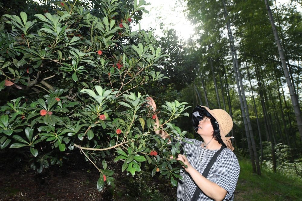 在浙江省仙居縣廣度鄉(xiāng)瓦垚頭村,浙江大學(xué)環(huán)境與資源學(xué)院教授吳良?xì)g結(jié)對(duì)指導(dǎo)的村民鄭文娟在查看楊梅長勢(7月4日攝)。新華社記者 翁忻旸 攝