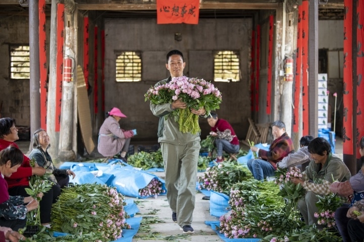 今年春天,浦江縣杭坪鎮(zhèn)烏漿村,薛勇帶著村民整理包裝采摘的芍藥花,“鮮花經(jīng)濟(jì)”帶動(dòng)村民共同奔富。共享聯(lián)盟·金華中心 胡肖飛 攝