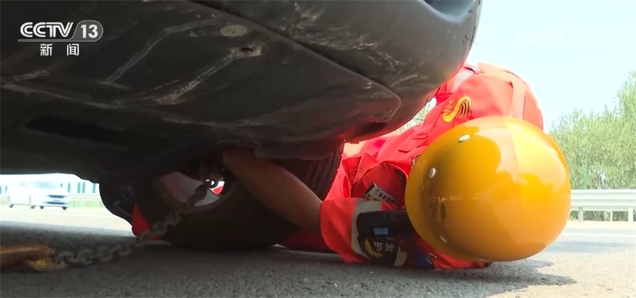 兩人將鐵鏈和拖車鉤工具套在故障車前底盤,但這得鉆進(jìn)車底,貼地操作。中午的高速柏油路面氣溫已經(jīng)逼近60℃,發(fā)燙的路面和陣陣熱浪讓人滿身灼熱感。隨后,兩人通過卷揚(yáng)機(jī)將故障車牽引到救援車上,再逐一固定好故障車的四個(gè)輪胎。高溫下在高速露天作業(yè),他倆的頭發(fā)上不斷甩出汗珠。