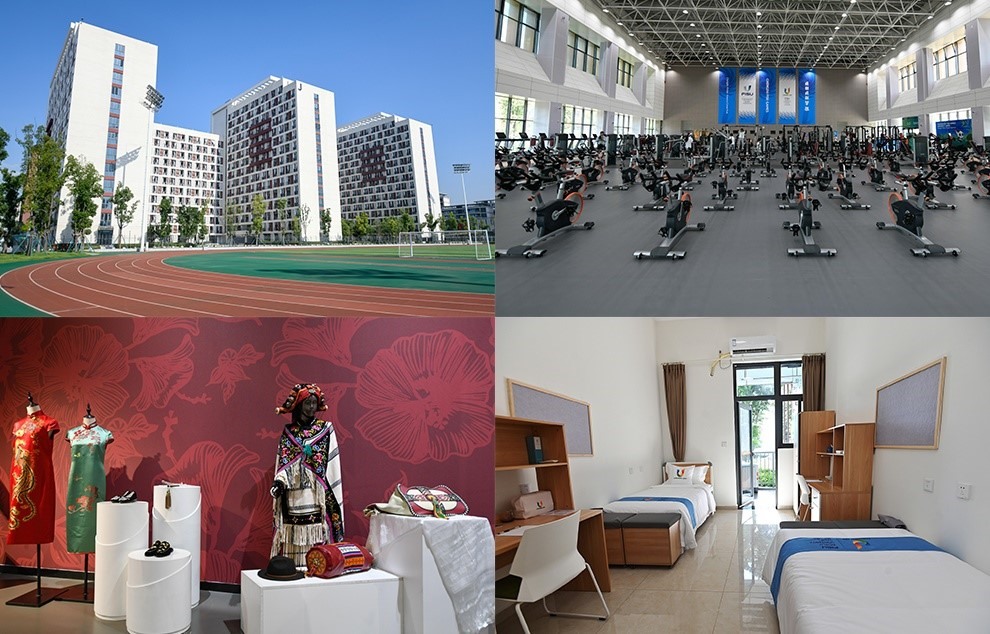△左上圖是大運村一處代表團公寓。右上圖是大運村健身中心的器械區(qū)。左下圖是大運村展覽中心內(nèi)的特色服飾展區(qū)。右下圖是大運村一間運動員宿舍。