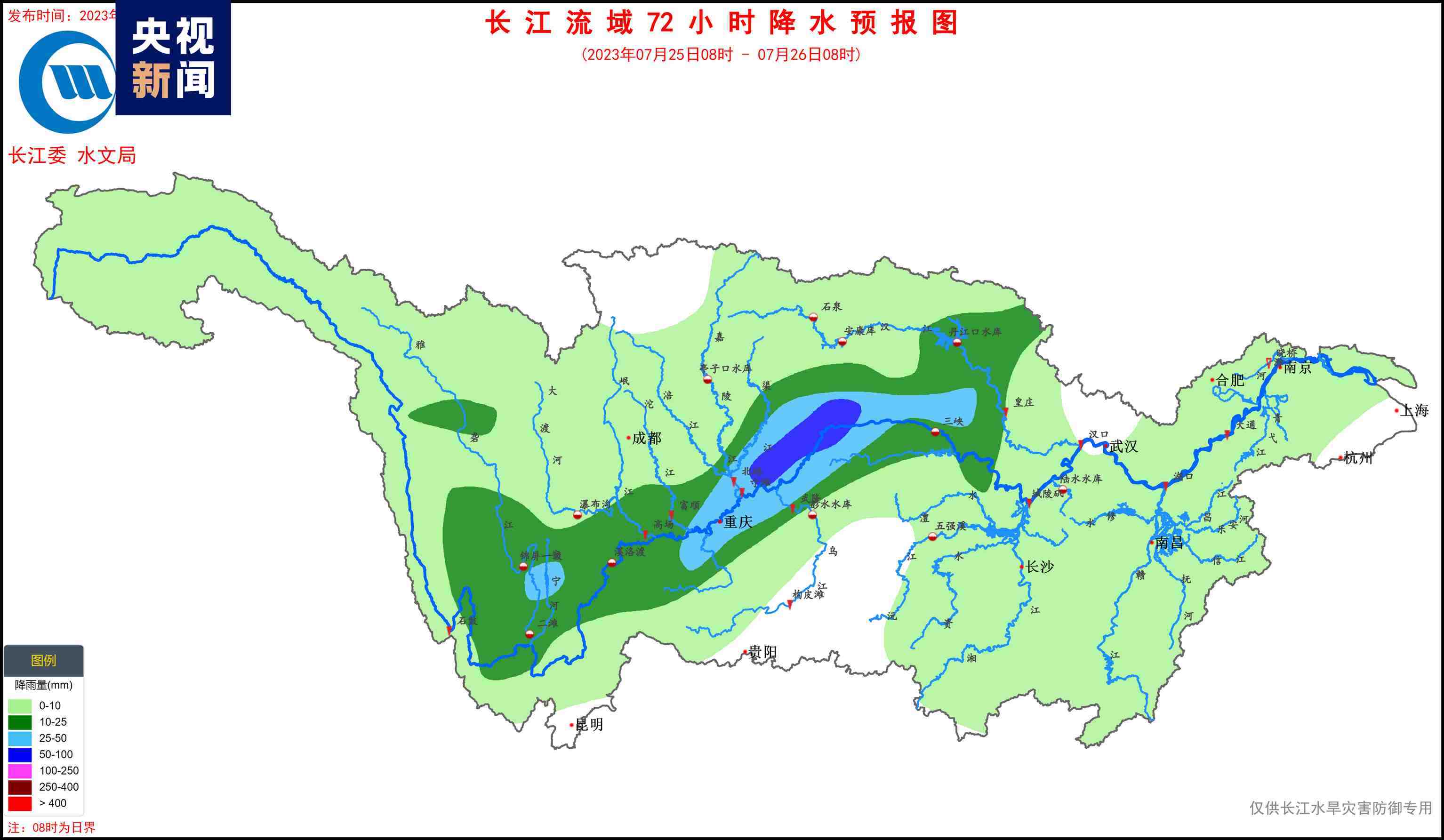 據(jù)水文氣象預報,7月23日,嘉岷流域北部有中雨、局地大雨;24~27日,長江上游干流附近有中到大雨、局地暴雨的降水過程,過程累計面雨量:長江上游干流70毫米,金沙江中下游、雅礱江、岷沱江、渠江、烏江上游30~50毫米??紤]預見期降雨,金沙江中下游、嘉岷流域、赤水河、烏江、三峽區(qū)間將發(fā)生漲水過程,降雨落區(qū)內部分中小河流可能發(fā)生超警洪水,局部強降雨引發(fā)山洪災害的風險高。