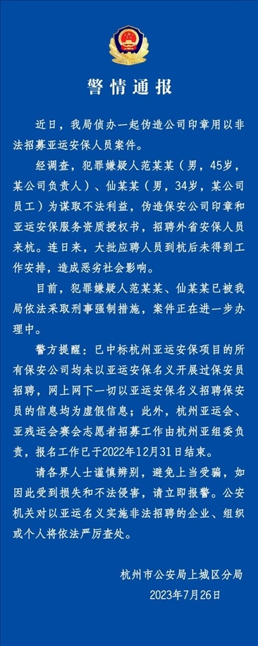 ·杭州警方:偽造公司印章非法招募亞運安保人員,2人被采取刑事強制措施。