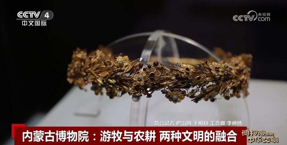 總臺(tái)記者 于明月:這里是位于呼和浩特市的內(nèi)蒙古博物院。從外觀上就能看出,這座建筑的設(shè)計(jì)靈感就來(lái)自于草原。它整體造型的寓意是美麗遼闊的草原上矗立著刻滿年輪的氈包,旁邊蜿蜒的小路象征著草原從幽深的遠(yuǎn)古走來(lái),又向美好的未來(lái)走去。兩側(cè)舒展的飄蓬代表著草原上圣潔的哈達(dá),迎接八方來(lái)客。這座博物院里面收藏有古生物化石、歷史文物、民族民俗文物15萬(wàn)余件,在眾多文物之中如果要說(shuō)出一件鎮(zhèn)館之寶,大家一定會(huì)想到“鷹頂金冠飾”。
