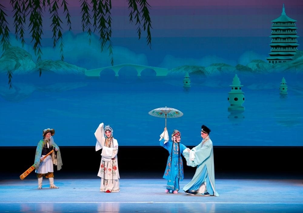 三潭印月的勝景出現(xiàn)在背景屏幕上,京劇《白蛇傳·游湖》拉開(kāi)了當(dāng)晚演出的序幕,一句“十年修得同船渡,百年修來(lái)共枕眠”將現(xiàn)場(chǎng)觀眾拉入中國(guó)民間傳說(shuō)的劇情?!赌九妓C萃》展示了表演者對(duì)于手中木偶精巧的控制能力,《中華醫(yī)藥》則將中藥的各種藥材名稱巧妙地融合在唱詞中。最后上演的川劇《白蛇傳·金山寺》選段則集川劇表演技巧之大成,白素貞的“烏龍絞柱”等技術(shù)動(dòng)作生動(dòng)模擬了蛇類的形態(tài),而紫金鐃缽的變臉絕技更是引得全場(chǎng)陣陣歡呼。