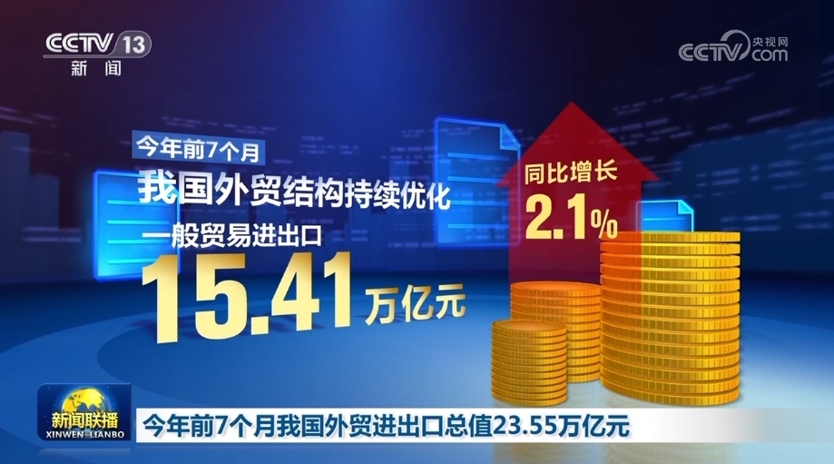央視網(wǎng)消息(新聞聯(lián)播):海關總署今天(8月8日)對外公布,今年前7個月,我國貨物貿(mào)易進出口總值23.55萬億元,外貿(mào)運行平穩(wěn)、符合預期。