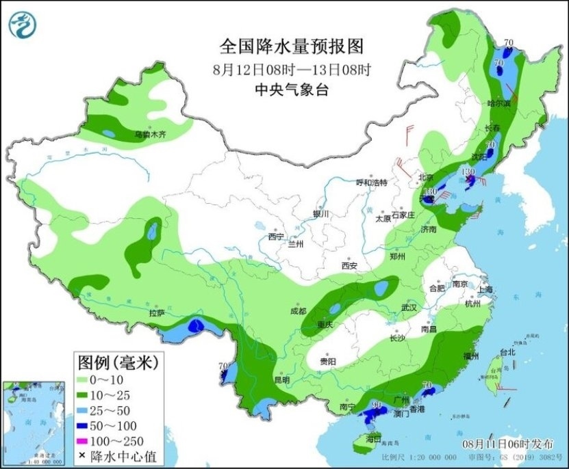 降雨預報:11日下午至13日,遼寧、吉林、黑龍江等地部分地區(qū)有大到暴雨,局地有大暴雨;大部地區(qū)累計雨量30~80毫米、局地100~150毫米,遼寧東部局地將超過200毫米。具體預報如下: