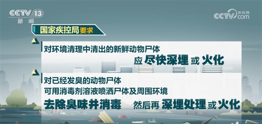 對環(huán)境清理中清出的新鮮動物尸體應(yīng)盡快深埋或火化,對已經(jīng)發(fā)臭的動物尸體,可用消毒劑溶液噴灑尸體及周圍環(huán)境,去除臭味并消毒,然后再深埋處理或火化。