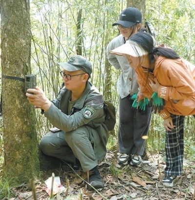 四川大相嶺大熊貓野化放歸研究基地巡護(hù)員在安裝調(diào)試紅外線相機(jī)。楊?lèi)?ài)玲攝