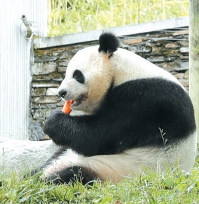 中國(guó)臥龍大熊貓繁育中心里的大熊貓?jiān)谶M(jìn)食。 孫信志攝