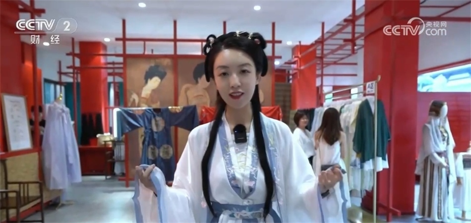 總臺央視記者 劉藝涵:沉浸式古鎮(zhèn)之旅一定少不了換裝體驗,也是不少游客來到這里首選的項目。目前,園區(qū)內(nèi)像這樣的古裝店共有7家,提供租賃、銷售、化妝造型和攝影等服務。現(xiàn)在我身上的這件就是店里的一款經(jīng)典的漢服,全天的租賃價格是199元。