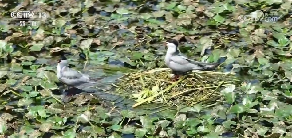 比如,兩地工作人員實(shí)現(xiàn)了聯(lián)合巡河、管護(hù)、治理。元蕩湖生態(tài)岸線(xiàn)的相關(guān)建設(shè),包括我所在的這個(gè)公園和步行橋也是兩地統(tǒng)一審批、接力建設(shè)起來(lái)的。目前,元蕩湖水質(zhì)已經(jīng)達(dá)到國(guó)家考核目標(biāo),生態(tài)岸線(xiàn)占比超過(guò)80%。在湖心的位置有一處水草聚集區(qū)域,船是不會(huì)靠近的,這是人為劃定的水上鳥(niǎo)兒的保育區(qū),能看見(jiàn)不少水鳥(niǎo)在那里嬉戲飛翔。鏡頭拉近,有的鳥(niǎo)兒已經(jīng)在這里筑巢產(chǎn)卵,把家安在了元蕩湖,水質(zhì)好不好,鳥(niǎo)兒最有發(fā)言權(quán)?,F(xiàn)在,元蕩湖在水系連通、河道清障、岸坡整治、水源涵養(yǎng)等方面實(shí)現(xiàn)了統(tǒng)一推進(jìn)。