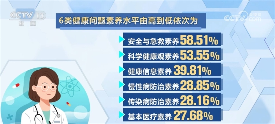 6類(lèi)健康問(wèn)題素養(yǎng)水平由高到低依次為:安全與急救素養(yǎng)58.51%、科學(xué)健康觀素養(yǎng)53.55%、健康信息素養(yǎng)39.81%、慢性病防治素養(yǎng)28.85%、傳染病防治素養(yǎng)28.16%和基本醫(yī)療素養(yǎng)27.68%。各類(lèi)健康問(wèn)題素養(yǎng)均有不同程度提升,其中,健康信息素養(yǎng)水平增幅最大,較2021年提升了3.88個(gè)百分點(diǎn)。本次監(jiān)測(cè)覆蓋31個(gè)省(自治區(qū)、直轄市)的336個(gè)縣(區(qū))1008個(gè)鄉(xiāng)鎮(zhèn)(街道),對(duì)象為15—69歲常住人口。