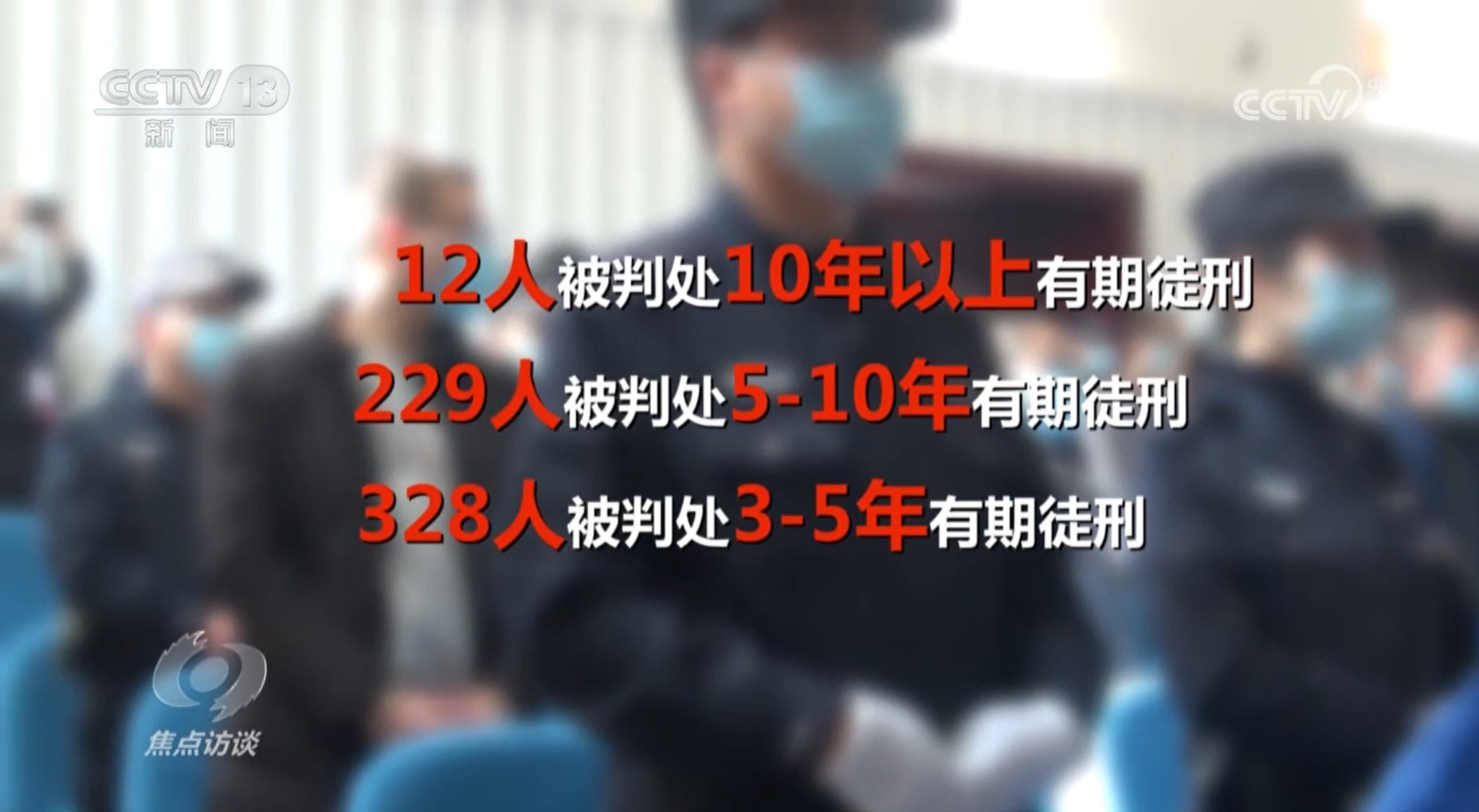其中,有12人被判處10年以上有期徒刑,229人被判處5-10年有期徒刑,328人被判處3-5年有期徒刑,所有被告人都被處一定金額的罰金。