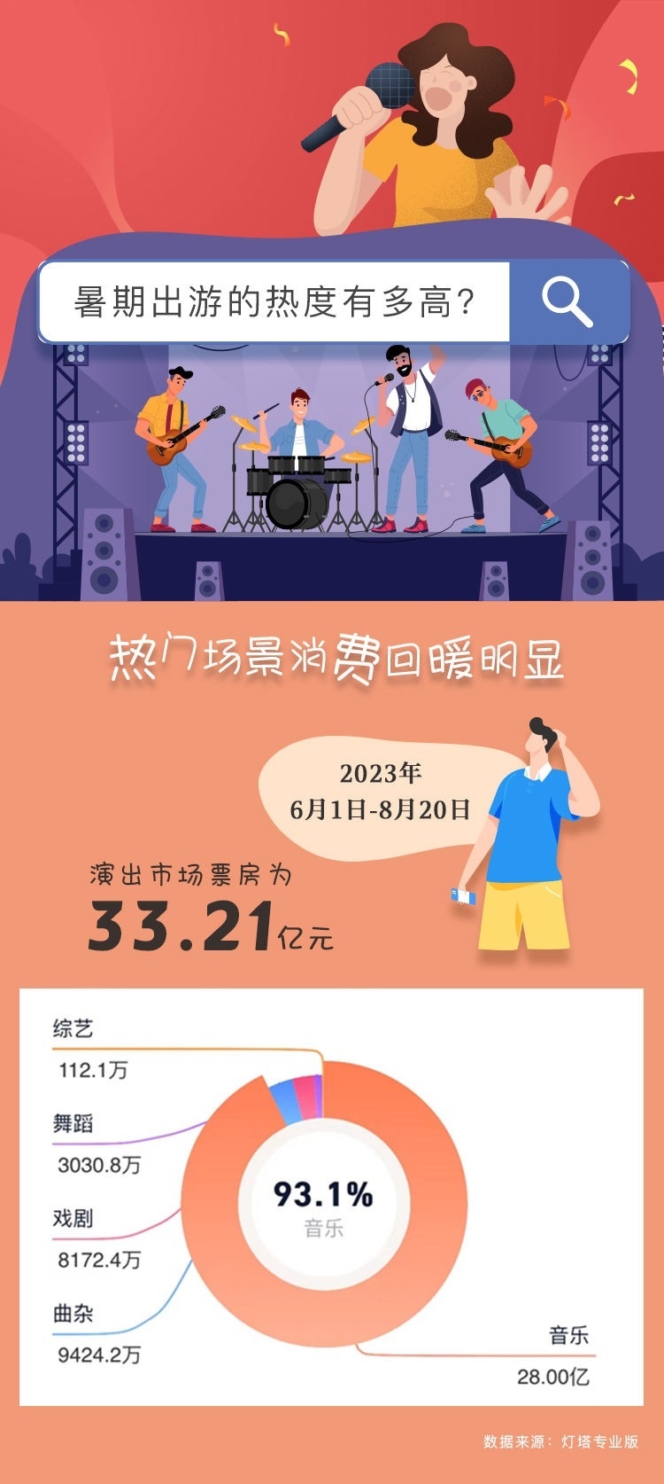 作為演出市場的傳統(tǒng)旺季,暑假期間演唱會、Live house、戲劇、音樂劇等各類熱門演出“一票難求”。根據(jù)燈塔專業(yè)版最新數(shù)據(jù),暑期檔中的6月1日至8月23日演出市場票房已經(jīng)超過30億元,而相當(dāng)可觀的跨城觀演比例,更引得除了演出票房之外的周邊產(chǎn)業(yè)一起火。“一個演出圈粉一座城”,當(dāng)?shù)芈糜谓?jīng)濟不斷涌現(xiàn)新的可能。
