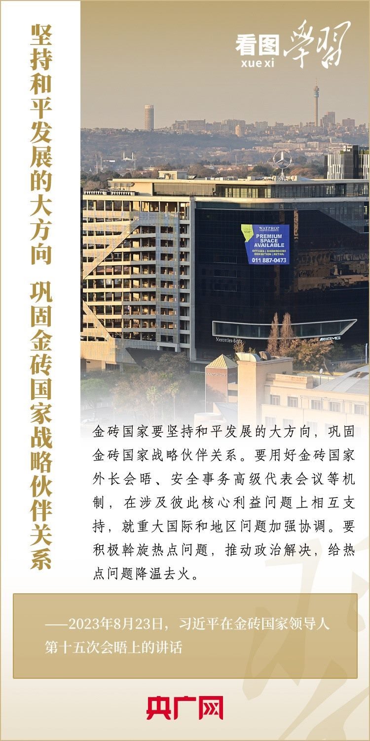 當(dāng)?shù)貢r(shí)間8月23日,習(xí)近平主席出席金磚國(guó)家領(lǐng)導(dǎo)人第十五次會(huì)晤并發(fā)表重要講話,強(qiáng)調(diào)金磚國(guó)家要秉持開放包容、合作共贏的金磚精神,以金磚責(zé)任應(yīng)對(duì)共同挑戰(zhàn),以金磚擔(dān)當(dāng)開創(chuàng)美好未來(lái)。一起來(lái)學(xué)習(xí)!