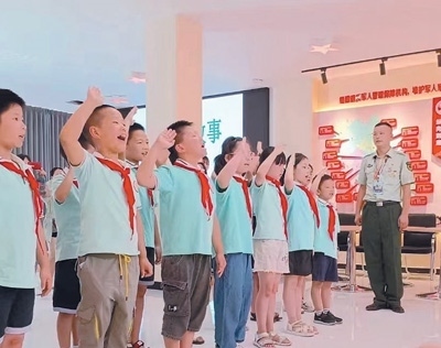 四川鹽亭縣文同小學學生在縣退役軍人之家活動中心學習英模事跡,獻唱少先隊隊歌。李 勤攝(人民視覺)