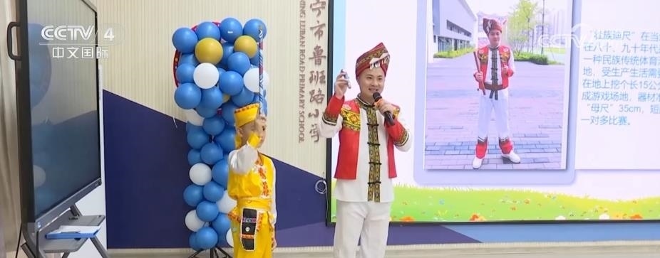 在南寧市魯班路小學,同學們領(lǐng)略了獨具壯族特色的體育活動《迪尺小課堂》。同學們還在開學典禮上身穿自己設(shè)計制作的扎染服飾,手拿親手制作的紅陶、皮影等非遺作品,表演了一場非遺秀。
