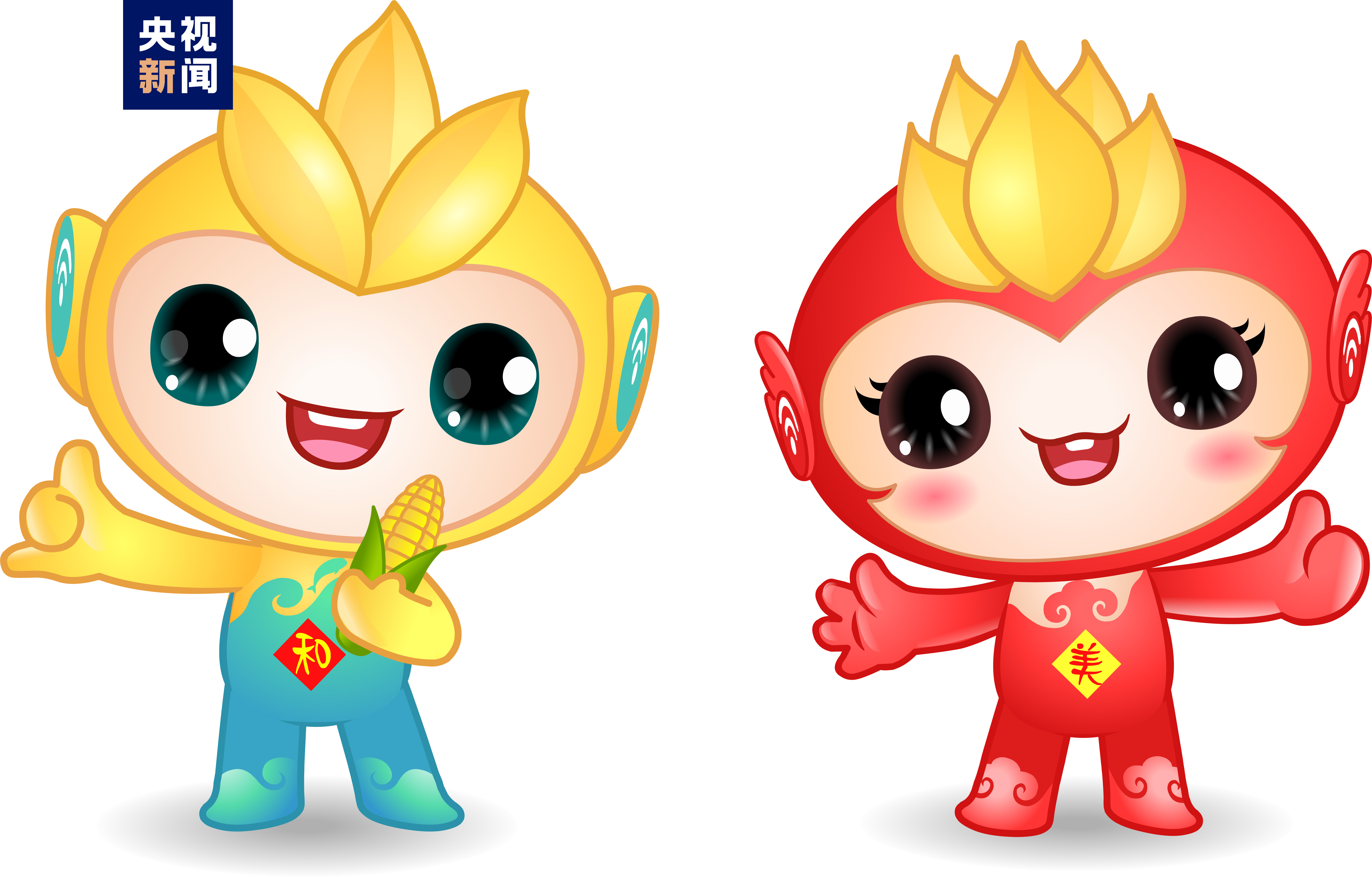 此外,今年中國農(nóng)民豐收節(jié)的吉祥物是“和和”“美美”兩個卡通IP形象,表達了億萬農(nóng)民甜甜美美的豐收喜悅、和和睦睦的幸福生活。IP卡通形象的整體設計,以三大主糧“稻谷、麥穗、玉米”為造型元素,突出豐收節(jié)屬性,融入傳統(tǒng)文化符號與現(xiàn)代信息符號,傳遞豐收、喜悅、吉慶和農(nóng)業(yè)現(xiàn)代化等寓意。其中,“和和”是一個男孩形象,頭上三粒稻谷,既代表種子,又代表三生萬物,繁榮不息。藍色波浪代表長江,江豚魚躍而上,寓意長江之畔,魚米之鄉(xiāng),風調(diào)雨順?!懊烂馈笔且粋€女孩形象,頭上五顆麥粒,寓意代表五谷豐登,表達了對農(nóng)民的最美好祝愿,融入了翅膀元素,昭示著中國農(nóng)業(yè)展翅騰飛,開創(chuàng)新未來。吉祥物的眼睛和耳朵上分別含有信息、數(shù)字科技元素,寓意以科技眼、智慧耳賦能現(xiàn)代農(nóng)業(yè)騰飛,反映了科技賦能、智慧富農(nóng)的新時代現(xiàn)代農(nóng)業(yè)特征。色彩以黃色和紅色為主,分別代表耕地和喜慶,也是豐收黃和中國紅,是農(nóng)民和豐收的最直觀體現(xiàn)。起名“和和、美美”,表達了億萬農(nóng)民喜氣洋洋的豐收喜悅、幸福和美的美好生活。