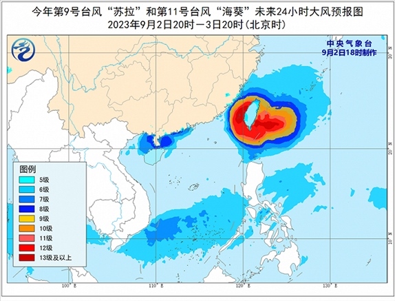大風(fēng)預(yù)報:9月2日20時至3日20時,受“蘇拉”影響,廣東中西部沿海、廣西南部沿海、海南島北部沿海、珠江口及澳門等地將有6-7級大風(fēng),南海西北部、北部灣東部和瓊州海峽將有8級、陣風(fēng)9-10級的大風(fēng);受“??庇绊懀褪亢{南部、臺灣海峽西部、東海南部及釣魚島附近海域、浙江南部沿海、福建中北部沿海、臺灣島沿海將有6-8級、陣風(fēng)9-10級大風(fēng),巴士海峽北部、臺灣海峽東部、臺灣以東洋面及臺灣島南部沿海的風(fēng)力有9-12級,陣風(fēng)13-14級,“海葵”中心經(jīng)過的附近海面或地區(qū)的風(fēng)力有13-16級,陣風(fēng)17級。