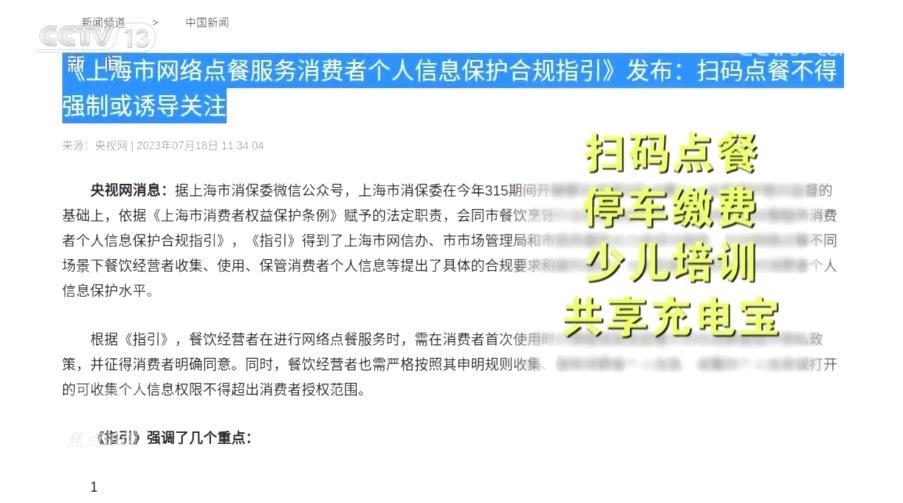 為了加強(qiáng)個(gè)人信息保護(hù),上海市消保委自7月起針對掃碼點(diǎn)餐、停車?yán)U費(fèi)、少兒培訓(xùn)和共享充電寶等四種消費(fèi)場景,分別出臺了合規(guī)指引、自律承諾和合規(guī)清單。未來,還將針對房產(chǎn)中介、商超購物等主要消費(fèi)場景作出相應(yīng)指引。