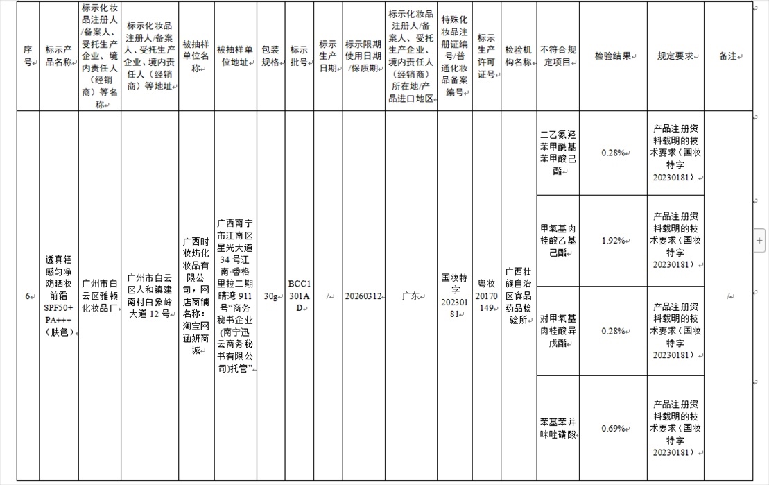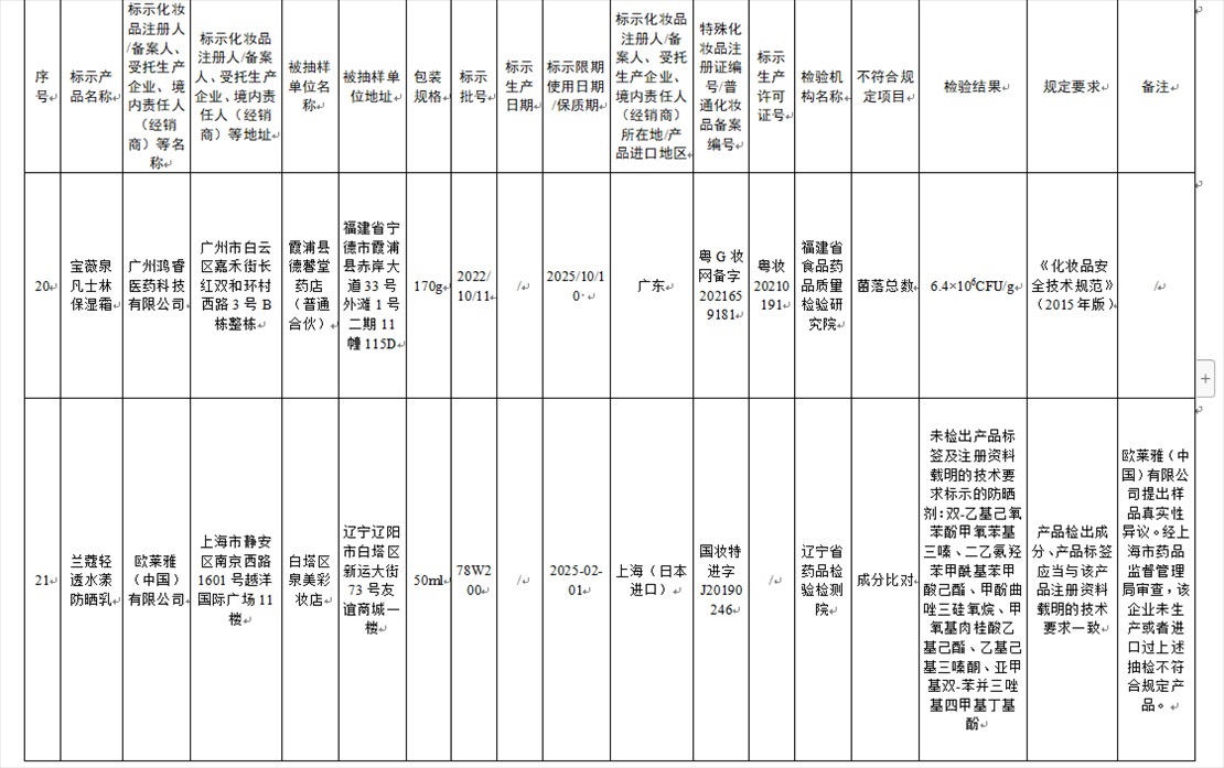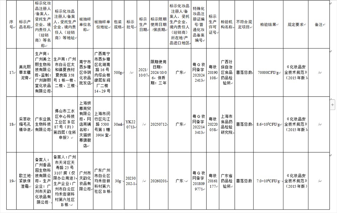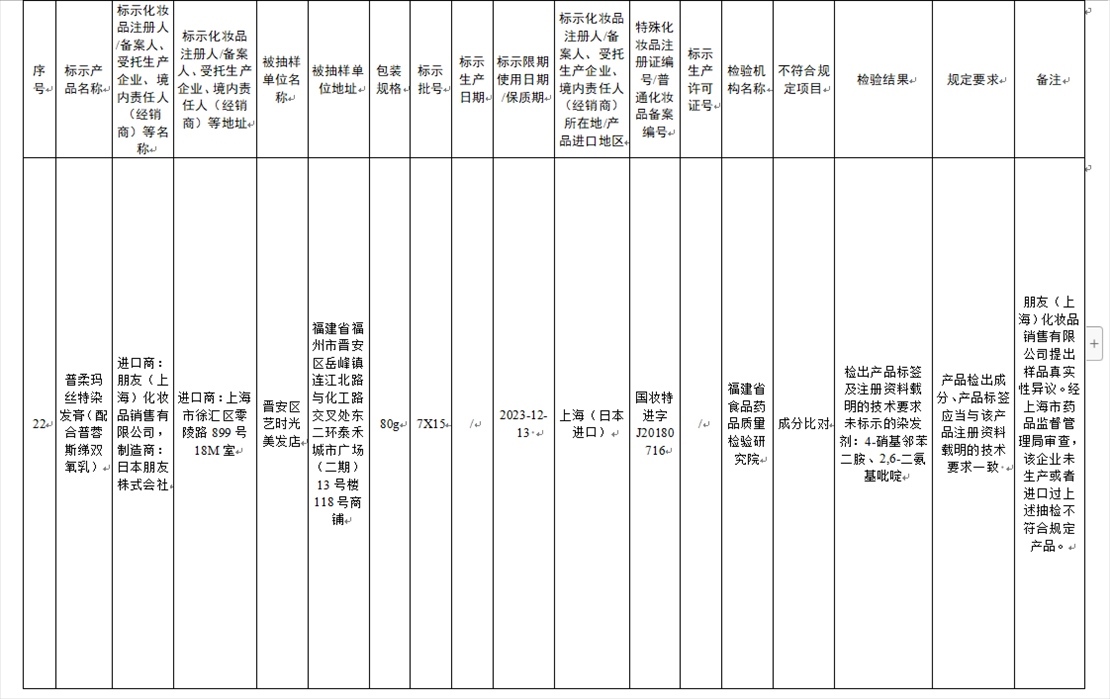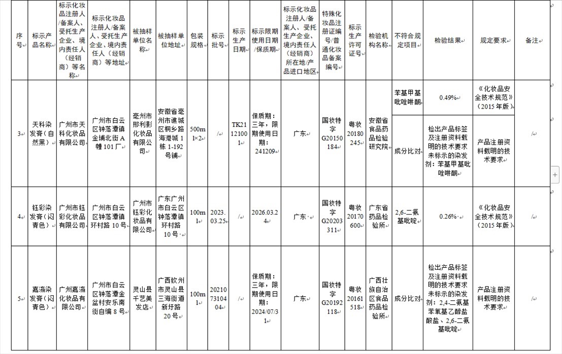 國家藥監(jiān)局網(wǎng)站今天發(fā)布通告稱,在2023年國家化妝品抽樣檢驗工作中,經(jīng)重慶市食品藥品檢驗檢測研究院等單位檢驗,產(chǎn)品標(biāo)簽標(biāo)示為廣州市天科化妝品有限公司生產(chǎn)的天科染發(fā)膏(自然黑)等23批次化妝品不符合規(guī)定(見下圖表格)。