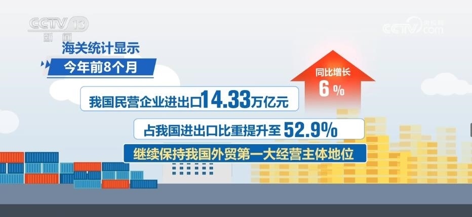 海關(guān)統(tǒng)計顯示,2023年前8個月,我國民營企業(yè)進出口14.33萬億元,同比增長6%,占我國進出口比重提升至52.9%,繼續(xù)保持我國外貿(mào)第一大經(jīng)營主體地位。
