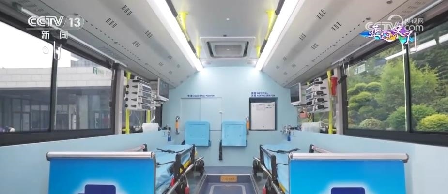 大型5G移動急救復蘇單元由兩輛公交車改裝而成,包含1輛急救治療車和1輛急救指揮車。急救治療車內設有2個擔架位和1個搶救床位,可同時轉運多名危重病人。車內配備了功能全面、集成度高的急救和轉運平臺,可以在車內開展體外呼吸循環(huán)支持和緊急救命性手術等復雜急救手段。